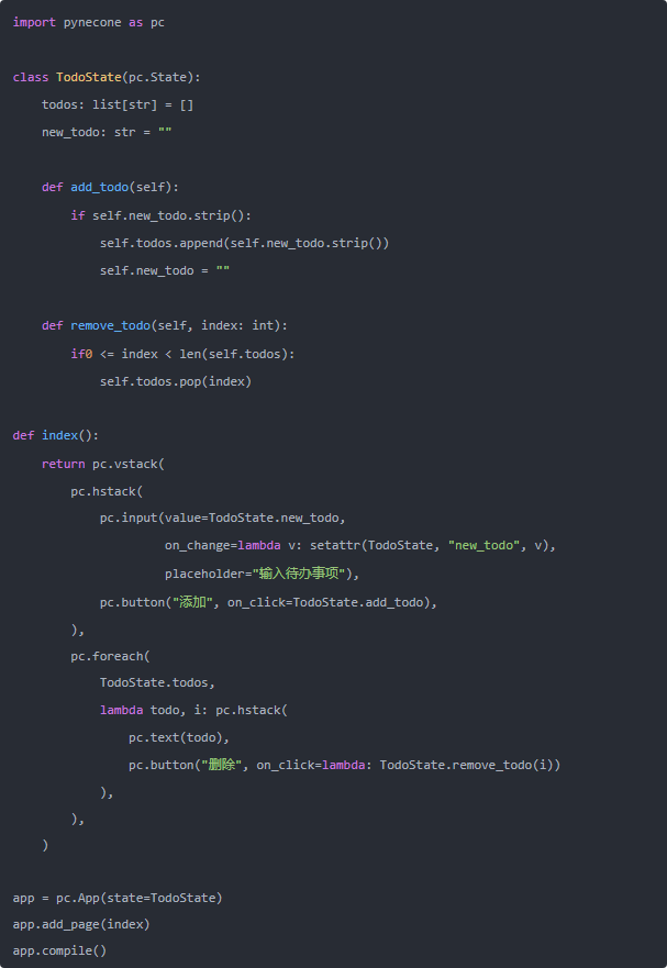 运行之后你就能得到一个网页:输入框打字点“添加”,列表里出现待办事项;点“删除”就把那条删掉。全程用 Python 写,逻辑和交互统一在一个 State 类里。