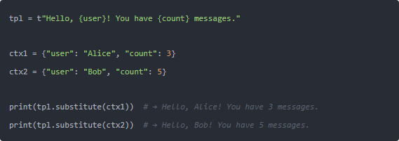 Python 3.14 引入了一种全新的字符串模板机制,称作 t-string(Template String Literals)。它的语法为:t"..."它与我们熟悉的 f"..." 不同,t-string 不会立即求值,而是保留模板结构供后续灵活处理。
