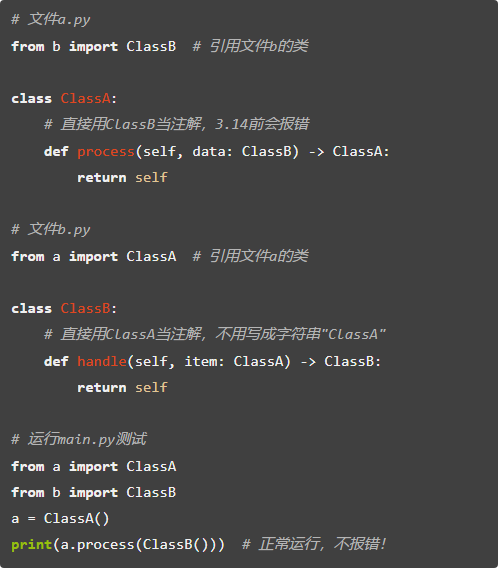 新手写多文件代码时,经常遇到“循环导入”报错:比如文件A引用文件B的类,文件B又引用文件A的类,一运行就崩。3.14让“注解”(函数参数后的类型说明)延迟生效,彻底解决这个问题。