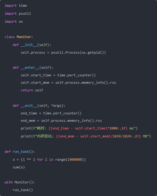 这样就能在任何代码块前后加个 with Monitor():,自动打印内存变化和耗时了。