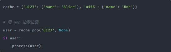 举个更真实的例子: 假设我们在做一个缓存系统,从缓存字典中取出用户数据,处理完就删除: