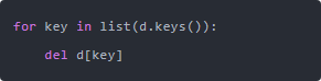 另一个问题是:如果你在遍历字典时使用 del 或 pop 会怎样? 在循环中直接修改字典会导致 RuntimeError,因为字典在被迭代时结构不能变化。这种情况下需要先取出键列表再删除: