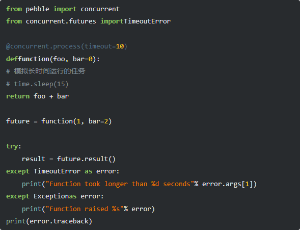 • 超时机制: Pebble允许为任务设置超时时间。如果任务在指定时间内未完成,则会抛出 TimeoutError 异常,防止程序阻塞。这对于处理可能长时间运行的任务非常实用,可以有效避免程序卡死。
