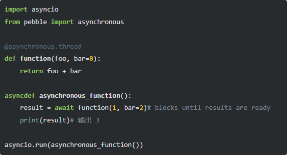 这段代码展示了如何使用 asyncio 库和 @asynchronous.thread 装饰器来实现异步线程。await function(1, bar=2) 会等待函数执行完毕并返回结果。