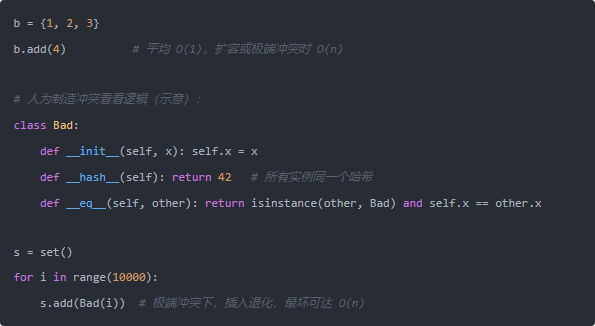 再看 set。哈希集合的平均插入是 O(1):算哈希,定位到桶位,空就放,冲突就按开放寻址或链表等策略解决。然而“最坏情况”有两种触发方式:一种是装载因子高了触发扩容,需要重新分配更大的哈希表并把所有元素重新放入,成本 O(n);另一种是极端哈希冲突(比如很多元素哈希值一样),一次插入就可能得线性探测,退化到 O(n)。因此,从“最坏”角度看,set 插入也可以到 O(n)。