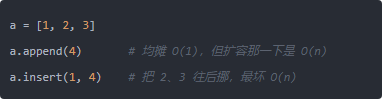 先看 list。往尾部 append 的摊还复杂度是 O(1),因为解释器会按倍数扩容,绝大多数时候只是把元素放到已经分配好的槽里;但“最坏情况”会发生在需要扩容的那一次,底层要申请更大内存并把旧元素拷过去,代价变成 O(n)。如果不是尾部而是插到中间位置,还要把后面的元素整体右移,最坏同样是 O(n)。所以从严格的“最坏”角度,list 插入可以到 O(n)。