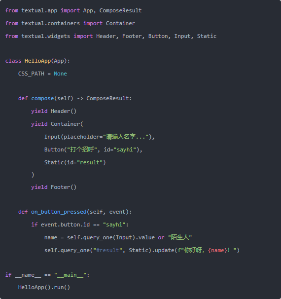 有趣的是,Textual 跟 Web 前端的思想还挺像。它里面的控件叫 Widget,布局用 Container 管理,还支持自己的 CSS 文件。对,就是那种写 #button { width: 50%; } 的 CSS。 我当时第一次看文档的时候真笑出声了:“好家伙,这不是前端写多了的产物嘛。”不过好处也明显——逻辑和样式分离得特别干净,比如你改字体颜色、改对齐方式,全都不用动 Python 代码,只要在 CSS 里写: