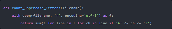 这版本其实就够用了,也挺“教科书式”的。 每一行读出来,再每个字符判断一遍,是不是大写。 最后返回统计结果。