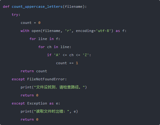 先别急着上代码,咱脑子里过一遍逻辑。题目说“计算一个文件中的大写字母数量”,那肯定分成两件事: 一个是“读文件”,另一个是“数大写字母”。 这两步拆开看就清楚多了。