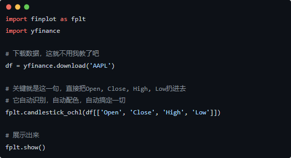 咱们直接看代码。假设你想看苹果公司(AAPL)从80年代到现在的K线图。用别的库你可能得折腾半天数据格式,用finplot,配合yfinance,几行代码搞定: