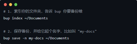 别光听我吹,咱们实际操作一下。假设你想备份你电脑里的 ~/Documents 文件夹。