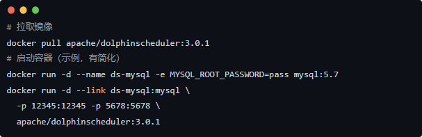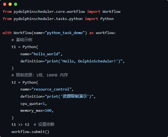 有了 Python SDK(pydolphinscheduler),你可以用代码定义工作流、提交、版本管理,示例非常简单: