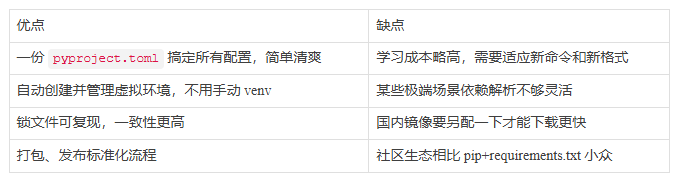 • 多文件管理:一个项目里五六个配置文件切来切去,心都累。只要看一个 pyproject.toml。