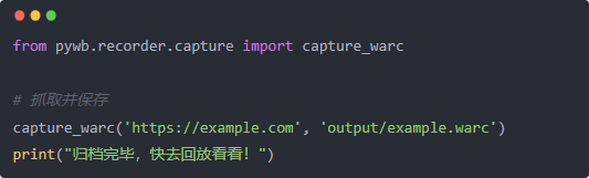 这么几行,就能把目标网站打包成 WARC,然后用同一套服务来回放。省时又省力。