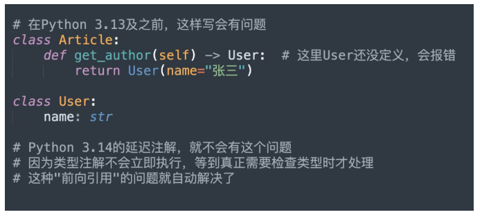 Python 3.14默认启用了延迟注解评估,简单说就是类型注解不会在定义的时候立即执行,而是等到真正需要的时候才去处理。这样一来,程序启动速度能提升不少,内存占用也会减少。
