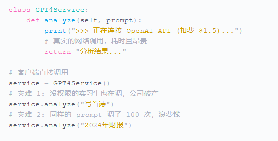 1缺乏访问控制 (Protection):谁都能调,没有鉴权。2性能浪费 (Caching):重复的请求没有缓存,直接穿透到昂贵的后端。3资源滥用 (Lazy Loading):有时只是初始化了对象但还没用,却建立昂贵的网络连接。我们需要一个 “网关”,在请求到达 GPT4Service 之前,把这些脏活累活全处理掉。
