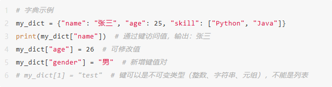 字典的键约束:键必须是不可变类型(整数、字符串、元组),列表、集合等可变类型不能作为键,否则会报错。