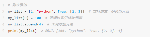 列表是 Python 中最常用的序列类型,用方括号 [] 定义,元素之间用逗号分隔,支持存储不同类型的数据(整数、字符串、对象等)。