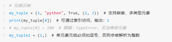 元组与列表结构相似,用圆括号 () 定义(空元组可直接写 (),单元素元组需加逗号(1,)),常被称为“不可变的列表”。