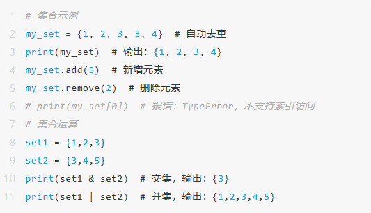集合同样用大括号 {} 定义(空集合需用 set(),而非 {},后者会被解析为字典),本质是无序的、不重复的元素集合,底层基于哈希表实现。