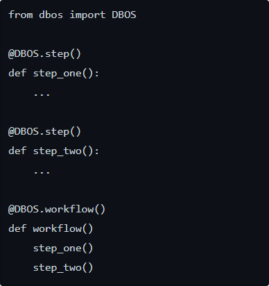 DBOS 工作流通过在 Postgres 中设置程序状态检查点来增强程序的持久性,如果程序发生故障,重新启动时,所有工作流将自动从上次完成的步骤恢复,我们可以通过将普通函数修改为工作流和步骤,将持久工作流添加到现有的 Python 程序中: