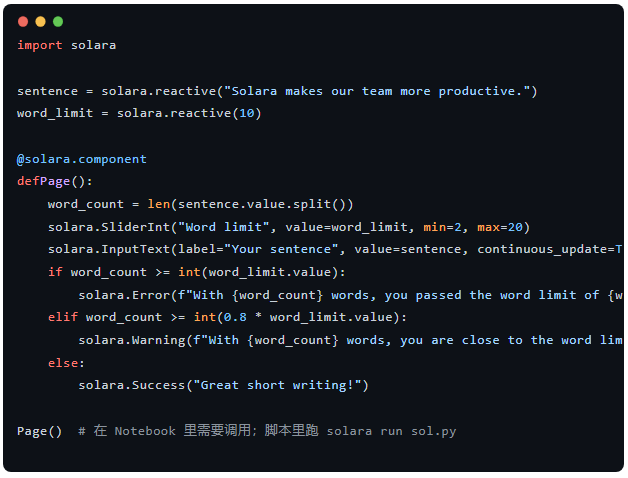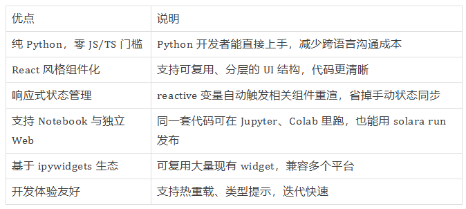 简单说,Solara 是一个用纯 Python 实现的、模仿 React 思想的框架。它把组件化、响应式状态管理这些前端好习惯带到 Jupyter 和 Web 应用开发里。换句话说,你不用写 JS 就能构建结构清晰、可复用、能扩容的交互式数据应用,既能在 Notebook 里跑,也能当独立的 web 服务跑。