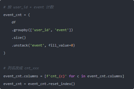 然后是那个 event_cnt,原来我在 apply 里手动 dict 计数。这个完全没必要,人家 groupby + size 就能办到,而且顺带还能帮你 pivot:
