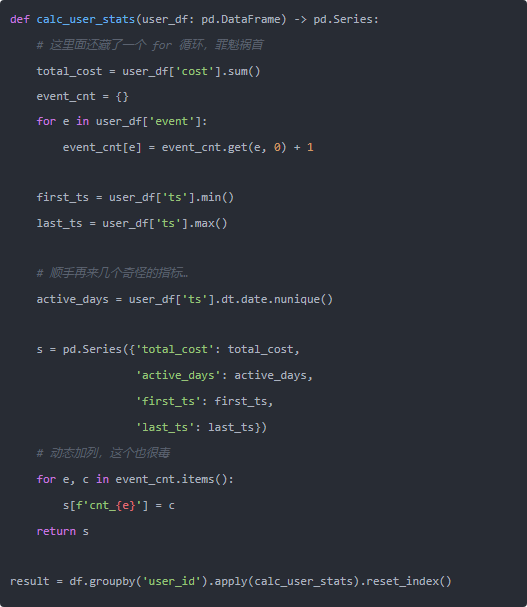 业务小哥的需求也很朴素: 每个用户统计一下各种事件次数、总金额、首末时间,顺带算个留存啥的。听起来就像“很适合用 groupby 啊,对吧”,于是年轻时候的我就写出了下面这坨——典型的“学会了一个 groupby,然后用到死”的代码: