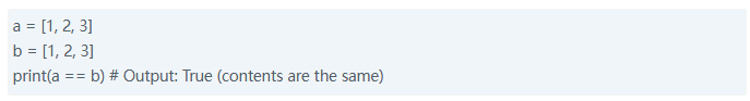 在这种情况下,a == b返回True,因为列表a和b的内容是相同的,尽管它们在内存中是单独的对象。