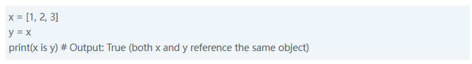 这里x is y返回True,因为x和y都指向内存中的同一个列表对象[1,2,3]。
