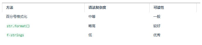 f-strings:语法简洁,支持表达式,是现代 Python 的推荐选择。