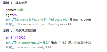 语法:"格式字符串" % (值1, 值2, ...)占位符:%s(字符串)、%d(整数)、%f(浮点数)等。