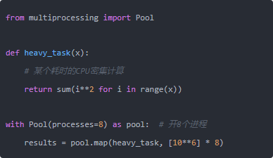 多进程的开销主要在进程启动和数据在进程间传递(序列化/反序列化)上。所以这个方法适合"任务颗粒度大、数据量不太大"的场景——每个子任务要跑几秒以上的计算,多进程的加速效果很明显;如果每个任务只需几毫秒,进程通信的开销会把收益吃掉。