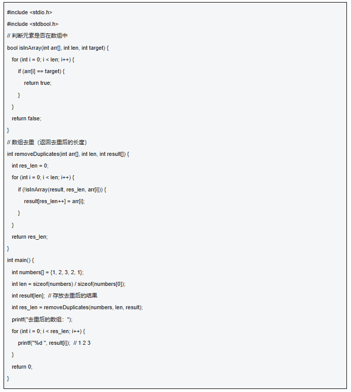 6. 元素顺序:Python集合是无序的,不保证元素的存储顺序;C语言数组是有序的,去重后仍保持原有的相对顺序(如果实现时保留)。