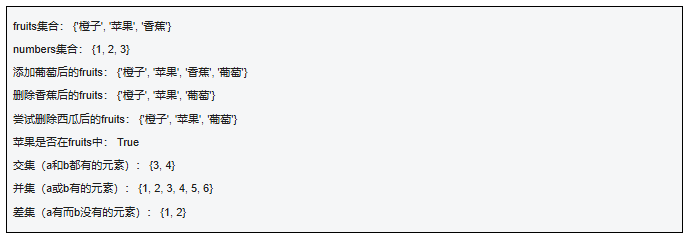 3. 元素判断:用元素 in 集合判断元素是否存在,由于集合底层用哈希表实现,判断速度比列表快得多(尤其是数据量大时)。