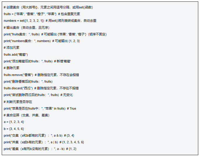1. 创建集合:用{}直接创建,或用set(可迭代对象)(如列表、元组)转换。集合的最大特点是自动去重和无序性(元素没有固定顺序,每次输出可能不同),这和列表、元组的有序性有本质区别。