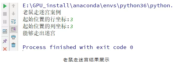 该实战技能要求输入老鼠出发的起始位置,输出老鼠是否能走出迷宫的结果。运行程序得 到的结果如下图所示。