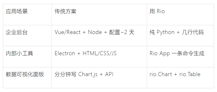 Python 后端写好了,前端还得转到 JS,切换思路好累。Rio 全程 Python,无缝衔接。