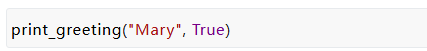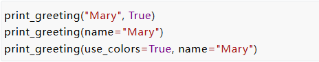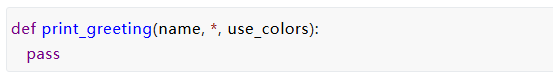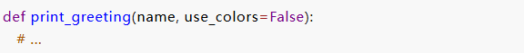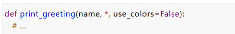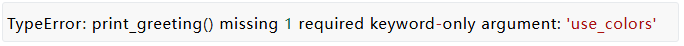 一旦我们有了这些Keyword-only限关键字的参数,我们还可以问“我们真的有好的默认值吗?” 假设我们意识到颜色代码的使用非常重要,并且每次使用 print_greeting 函数时都必须传递——我们没有一个好的默认值, 我们可以这样写我们的函数: