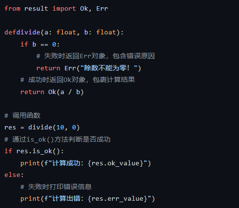 使用建议:在编写库或核心业务逻辑,且希望代码具有极高健壮性和类型安全时,推荐使用result;在编写简单的脚本或只有一两种已知错误状态时,使用try/except即可。