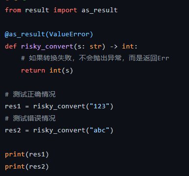 这对于调用第三方库时特别有用,可以瞬间将可能抛出异常的旧函数,转换为返回Result对象的现代化接口。