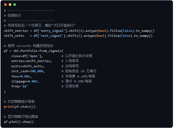 • • 它提供了一个完整可运行的回测框架,你可以直接替换股票代码来测试自己感兴趣的标的。