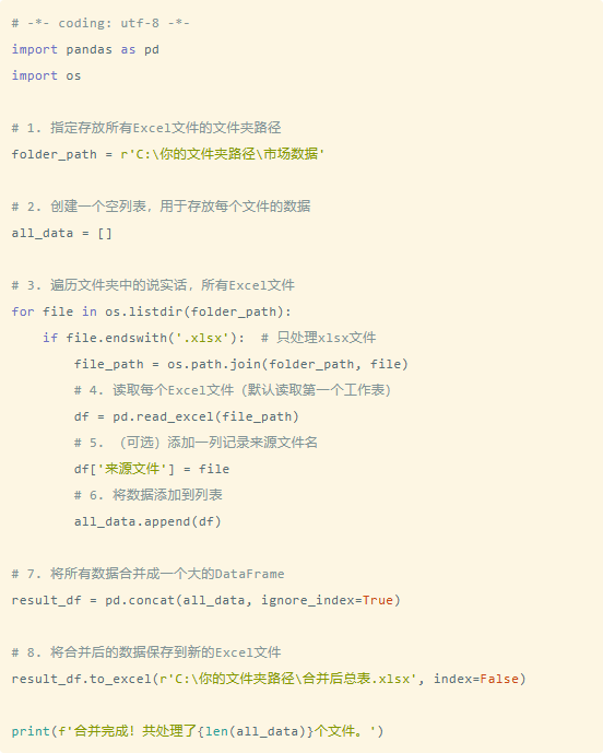 第二步:编写脚本 打开任何文本编辑器(如记事本、VS Code),新建一个文件,命名为merge_excel.py,粘贴以下代码: