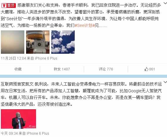 近日,乐视CEO贾跃亭在官方微博上置顶了一条消息称,已回京住院进一步治疗,无论经历多大磨难,推动人类进步的梦想永不改变,望着窗外的雾霾,承受着病痛的折磨,更深刻感到“See计划”一年多海外艰辛的值得。