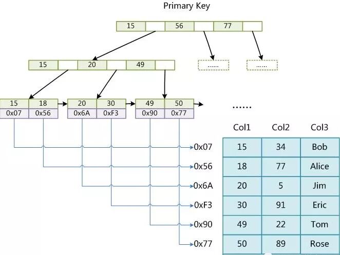 第二个与MyISAM索引的不同是InnoDB的辅助索引data域存储相应记录主键的值而不是地址。换句话说,InnoDB的所有辅助索引都引用主键作为data域。例如,图4为定义在Col3上的一个辅助索引: