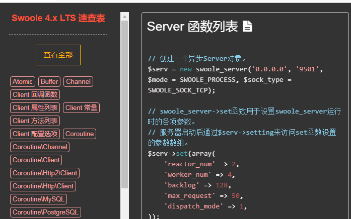Swoole 4.X速查表:https://toxmc.github.io/swoole-cs.github.io/