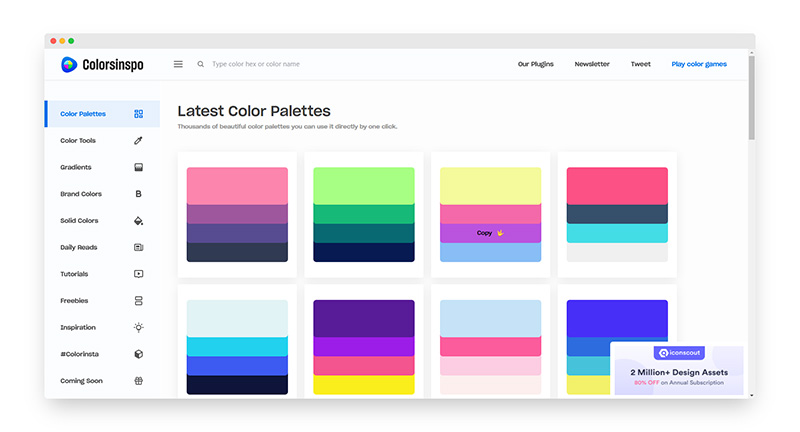 Colorsinspo 是一个色彩灵感在线调色板,收集超过上千款优秀的色彩搭配方案,只有单击需要的颜色复制色码即可使用,一个设计师和前端工程师值得拥有的在线配色工具,比以往Boss设计分享的调色工具都强大,一款最佳的设计调色工具。