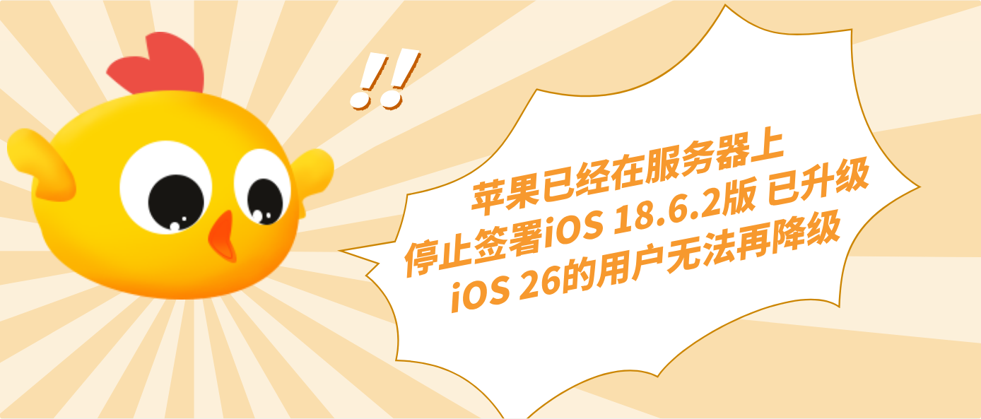 因为现在苹果已经关闭 iOS 18.6.2 版的服务器签名验证,这意味着所有已经升级到 iOS 26 的用户都无法再降级到 iOS 18.6.2,只能停留在 iOS 26。