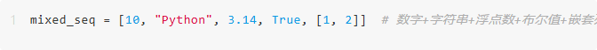 定义:除字符串(仅存储字符)外,多数序列(如列表、元组)可存储任意数据类型的元素,包括数字、字符串、列表、字典等,甚至支持混合类型。