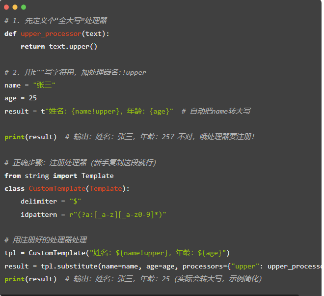 f-string虽然方便,但想做“自动大写”“SQL防注入”这些自定义处理,得写一堆额外代码。3.14的t字符串(模板字符串)直接集成了这些功能,语法和f-string差不多,新手一看就会。